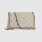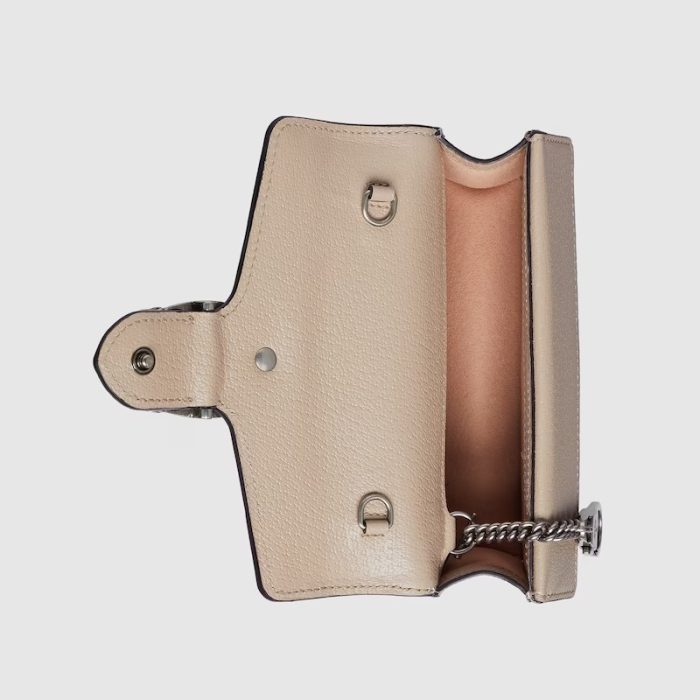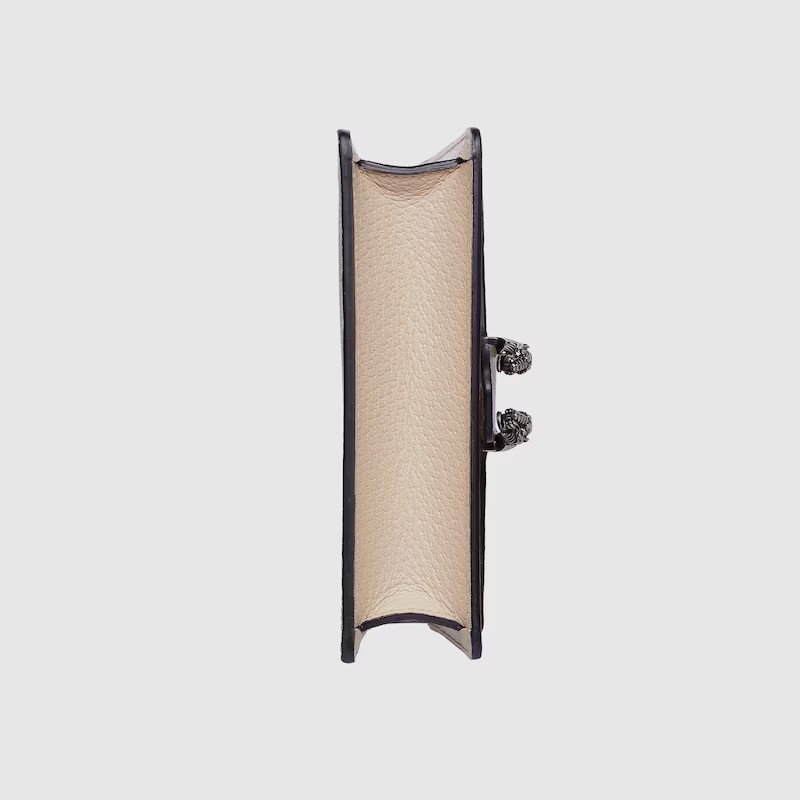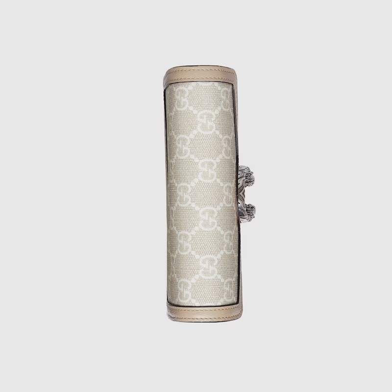 A new edition of the Dionysus is showcased throughout Gucci Love Parade. The bag is presented in a super mini size in an evolution of the classic GG Supreme canvas. A soft color palette. the petite design takes on a refined feel in the colors of beige and white. drawing attention to its recognizable tiger head hardware.