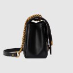 The GG Marmont has become synonymous with the House. thanks to its recognizable matelassé fabric and Double G hardware. Continuously reinvented through the seasons. new shapes are introduced within this signature line. matching Gucci’s contemporary vision. Here. it’s presented in black leather and further enriched with antique gold-toned details.