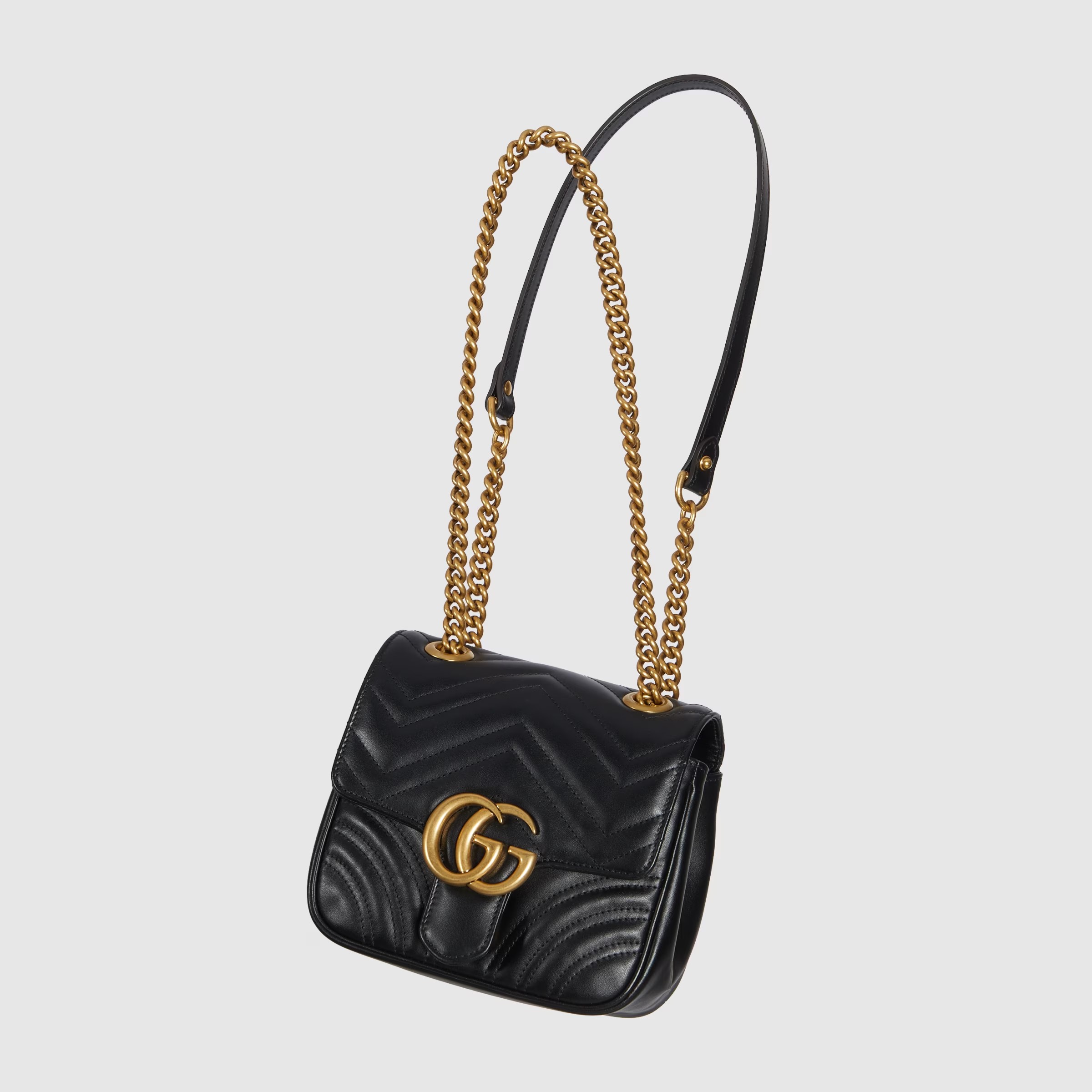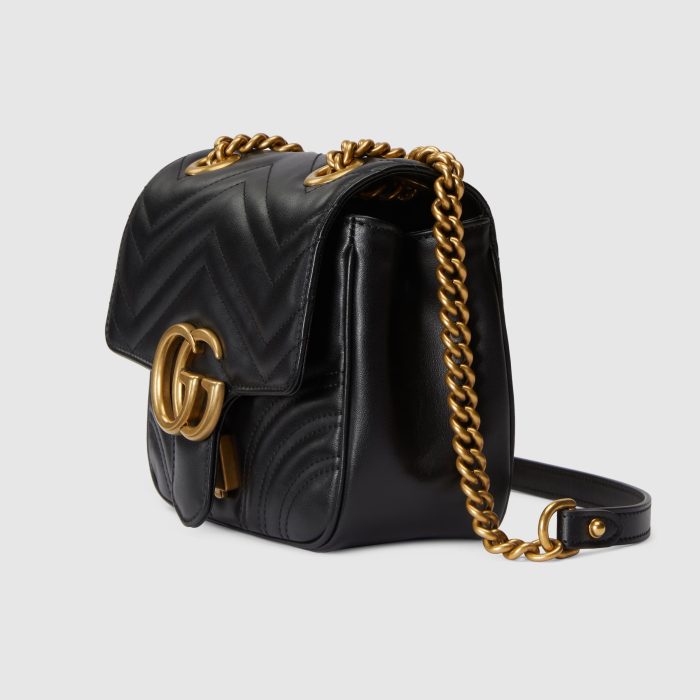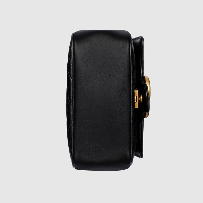 The GG Marmont has become synonymous with the House. thanks to its recognizable matelassé fabric and Double G hardware. Continuously reinvented through the seasons. new shapes are introduced within this signature line. matching Gucci’s contemporary vision. Here. it’s presented in black leather and further enriched with antique gold-toned details.
