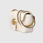 The small GG Marmont camera bag has a softly structured shape and a flap closure with Double G hardware. The sliding chain strap can be worn multiple ways. changing between a shoulder and a top handle bag. Made in matelassé chevron leather with a heart on the back.