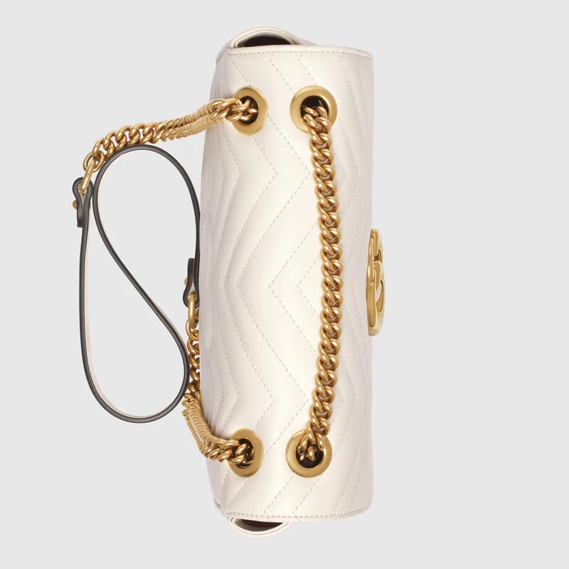 The small GG Marmont camera bag has a softly structured shape and a flap closure with Double G hardware. The sliding chain strap can be worn multiple ways. changing between a shoulder and a top handle bag. Made in matelassé chevron leather with a heart on the back.
