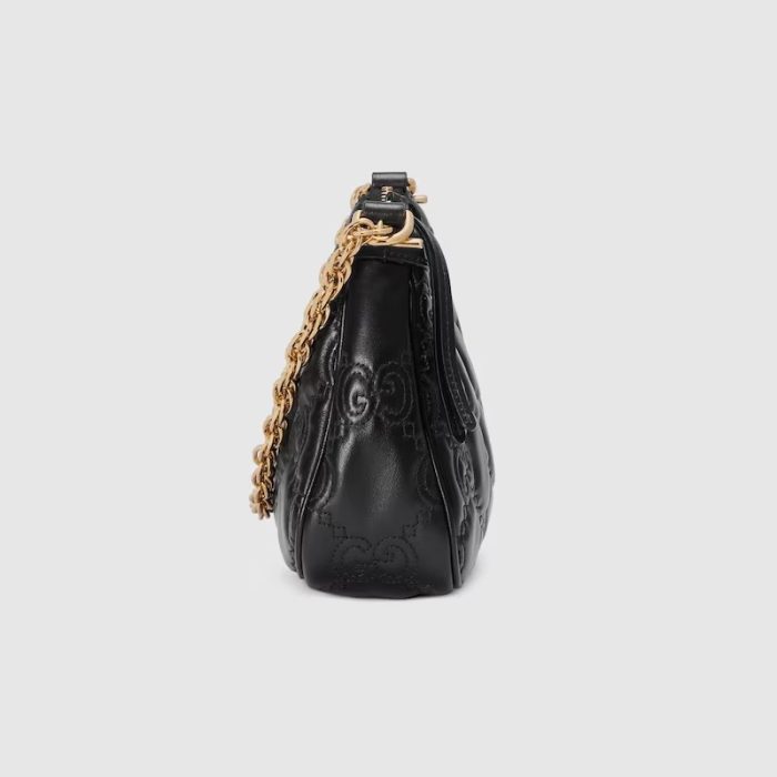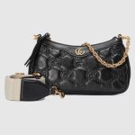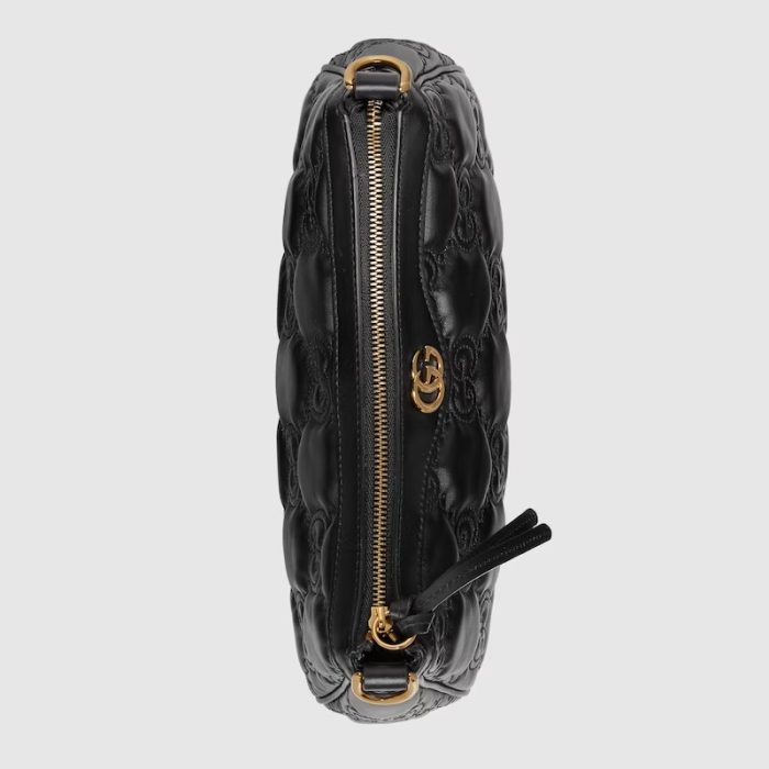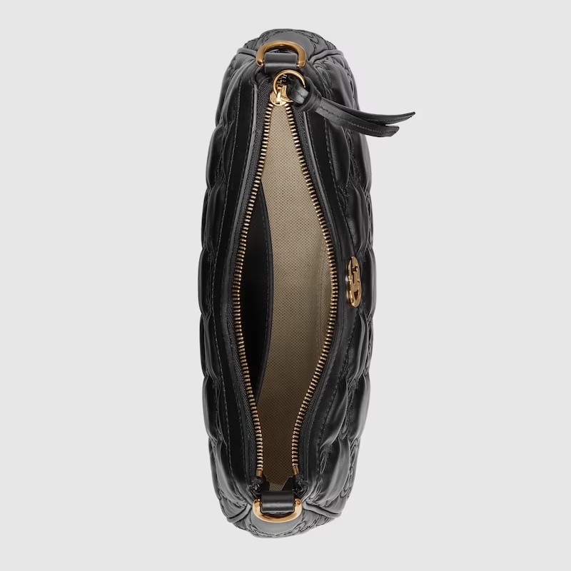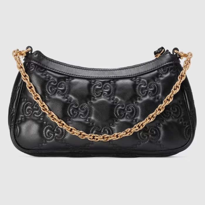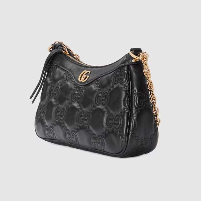 Matelassé leather is a signature material of the House. thanks to its super soft finish. The textured GG motif defines a selection of handbags. including this black leather bag. The Double G hardware decorates the front. continuing the logo feel of the design.