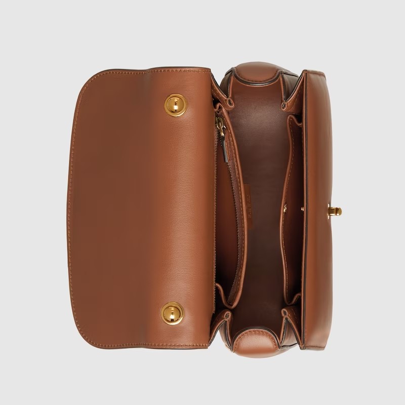 Taking inspiration from the House’s archives. a geometrically shaped version of the Round Interlocking G logo sits atop this top handle bag. The gold-toned hardware adds a defined vintage feel to the style. enriching the design with a timeless feel.