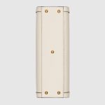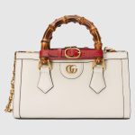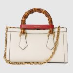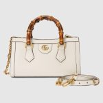 A new shape for Gucci Cosmogonie. the Gucci Diana continues to combine recognizable elements of the House with the bamboo handles and Double G hardware. Crafted from white leather. the accessory is further accentuated by two decorative leather belts. a playful reference to the bands used to keep handles in shape.