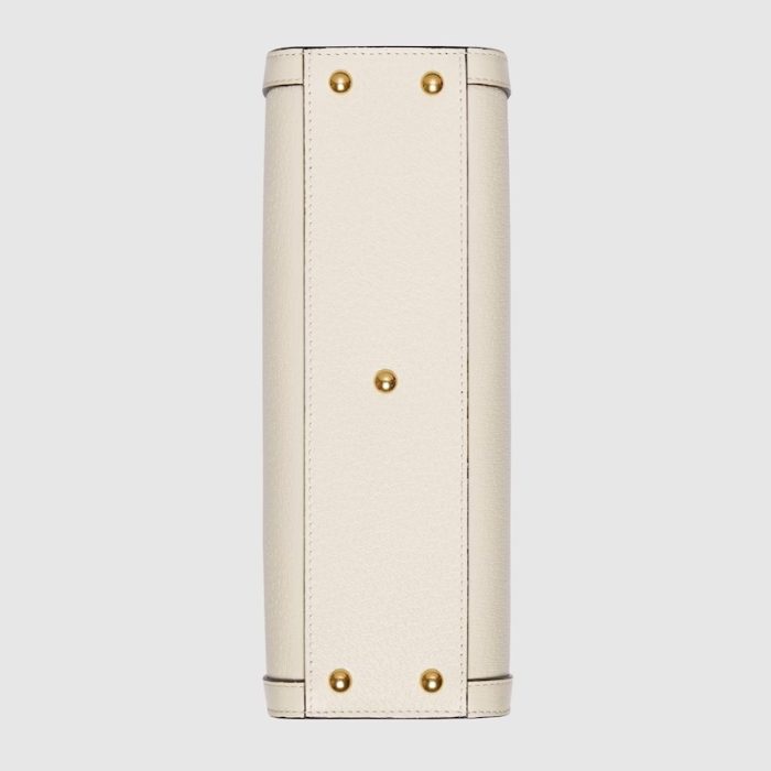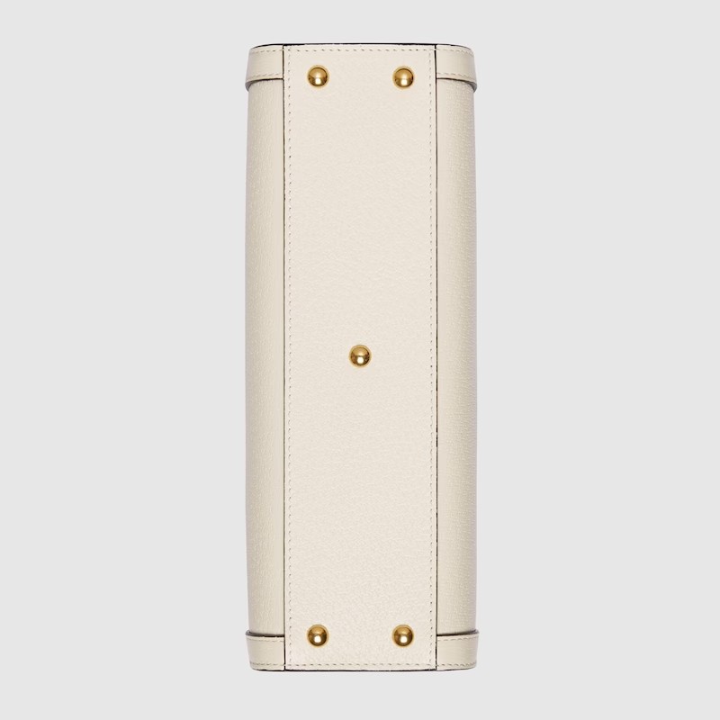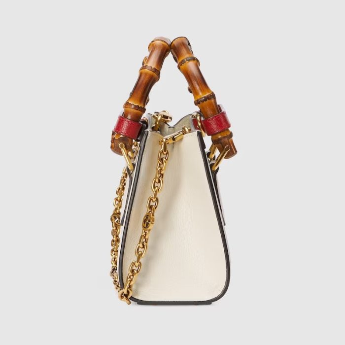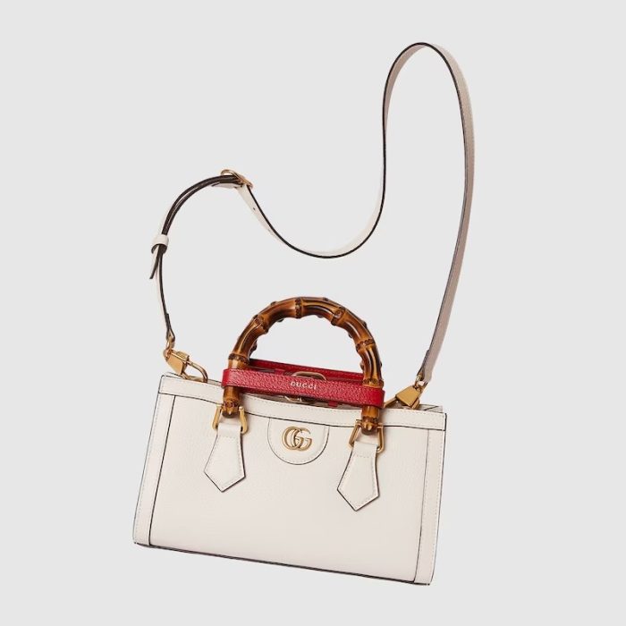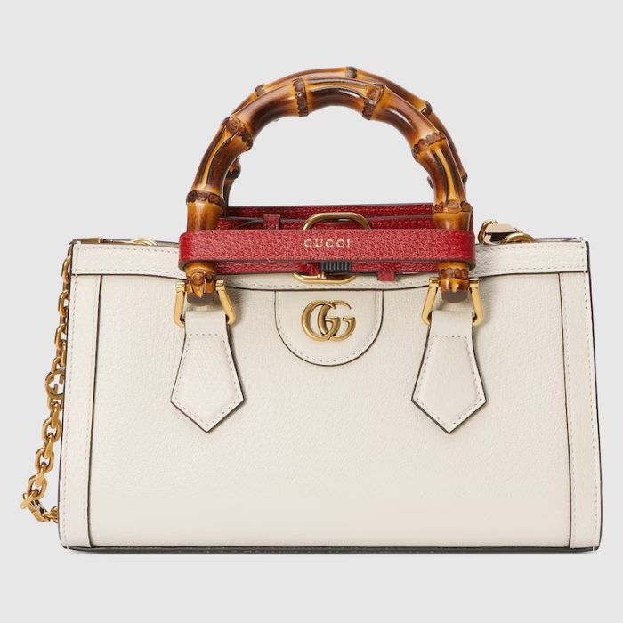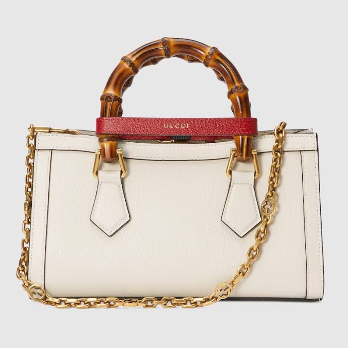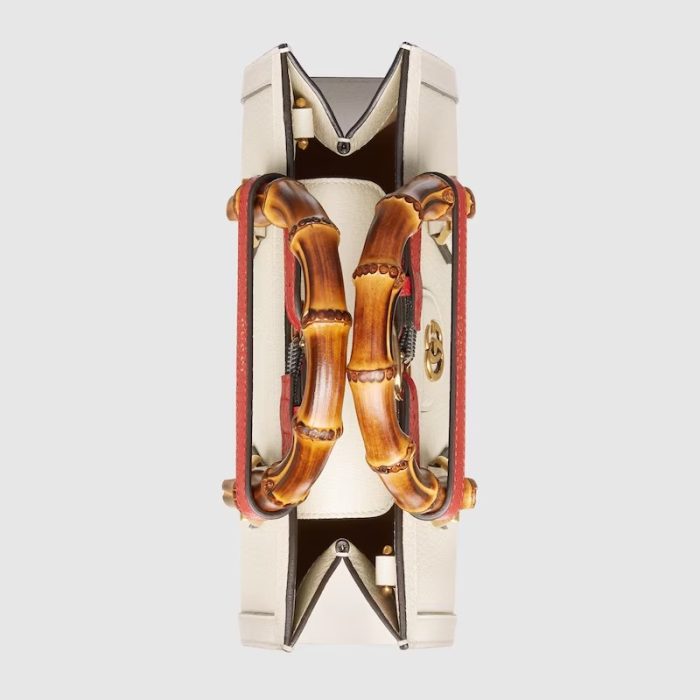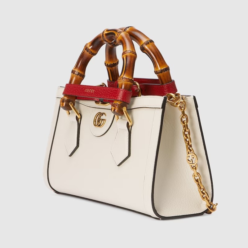 A new shape for Gucci Cosmogonie. the Gucci Diana continues to combine recognizable elements of the House with the bamboo handles and Double G hardware. Crafted from white leather. the accessory is further accentuated by two decorative leather belts. a playful reference to the bands used to keep handles in shape.