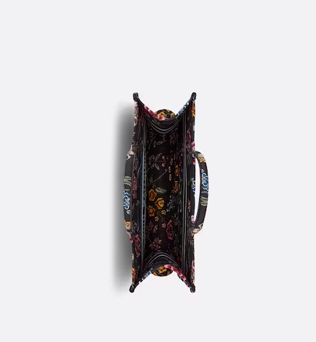 Introduced by Maria Grazia Chiuri. Creative Director of Christian Dior. the Dior Book Tote has become a staple of the Dior aesthetic. Designed to hold all daily essentials. the style is fully embroidered with a black multicolor Dior Petites Fleurs motif. a romantic and vibrant homage to Mr. Dior’s passion for florals. Adorned with the Christian Dior Paris signature on the front. the large tote exemplifies the House’s signature savoir-faire and may be carried by hand or worn over the shoulder.
