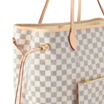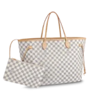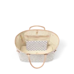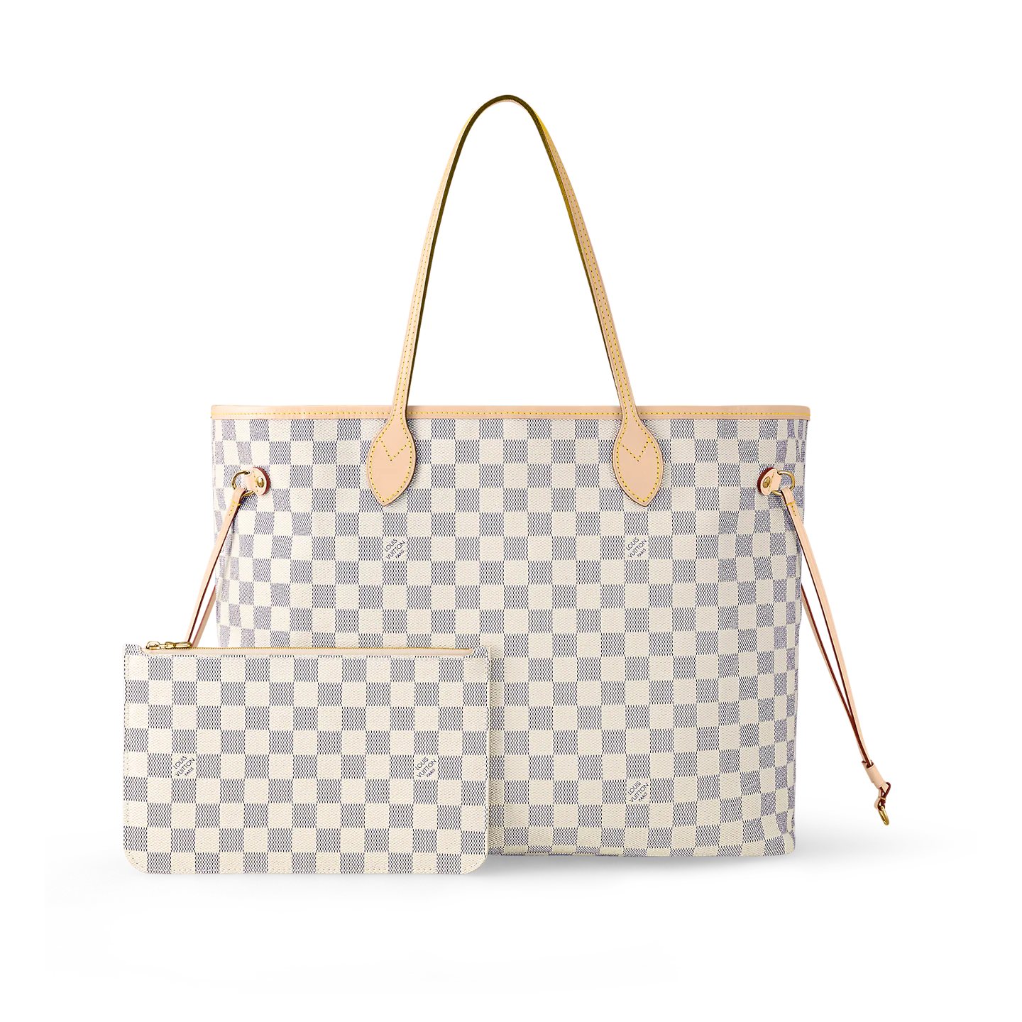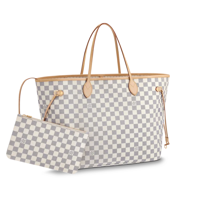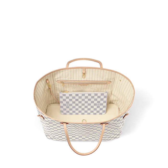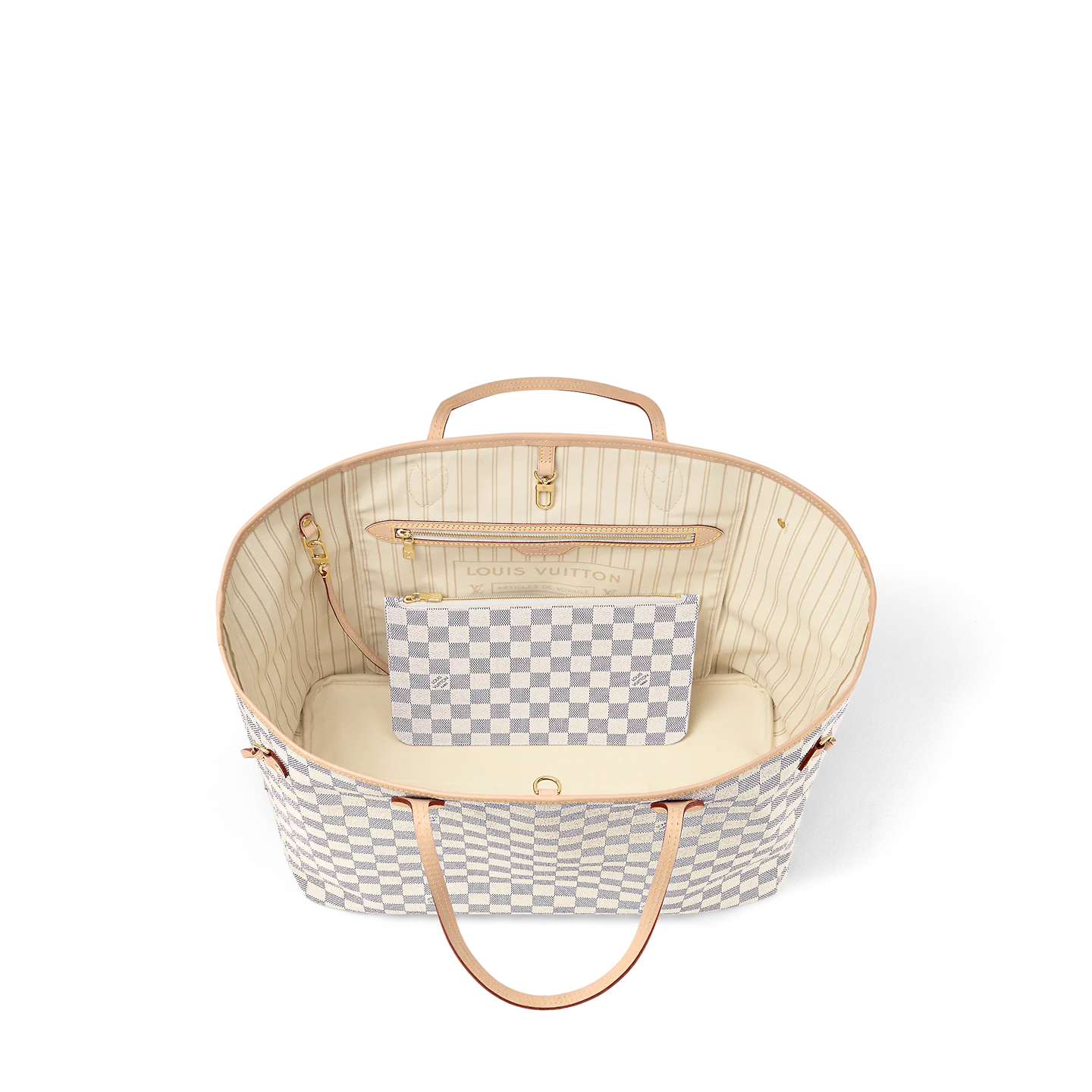 The Neverfull GM tote unites timeless design with heritage details. Crafted from fresh Damier Azur canvas with natural cowhide trim. it is ultra-roomy yet never bulky. with side laces that cinch for a sleek allure or loosen for a more casual look. Slim. comfortable handles slip easily over the shoulder or arm. Lined in colorful textile. it features a removable pouch which can serve as a clutch or an extra pocket.