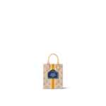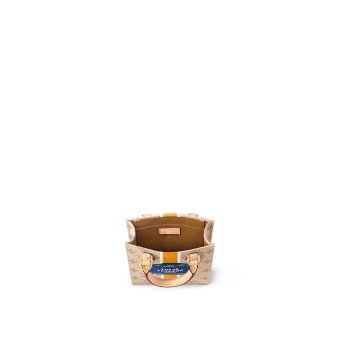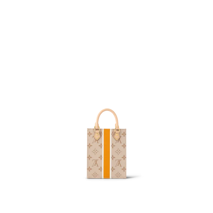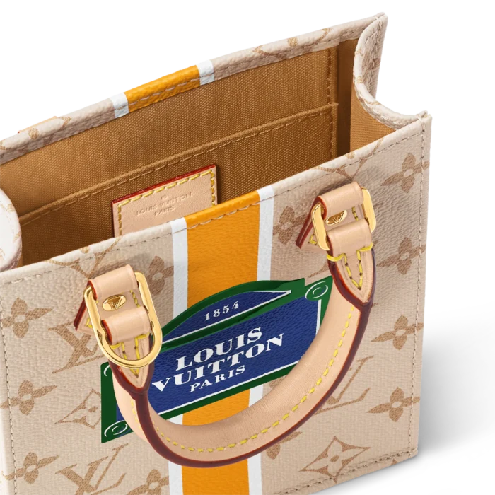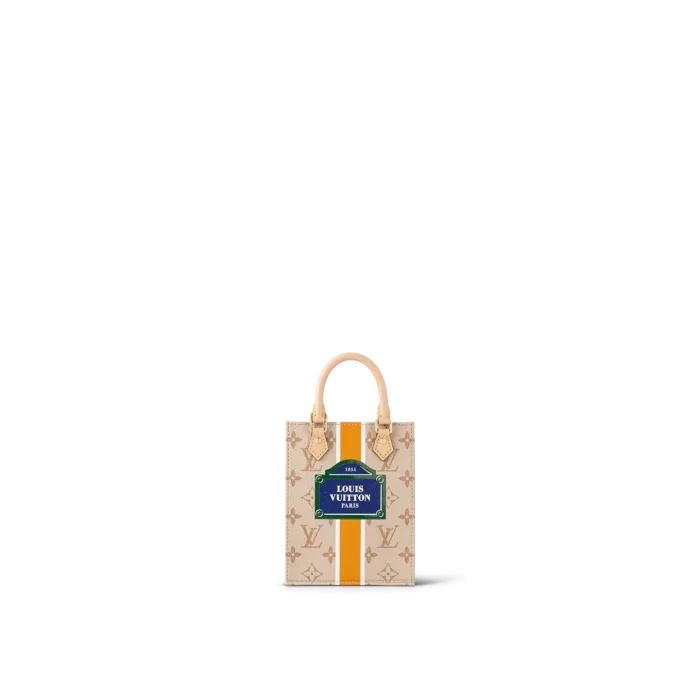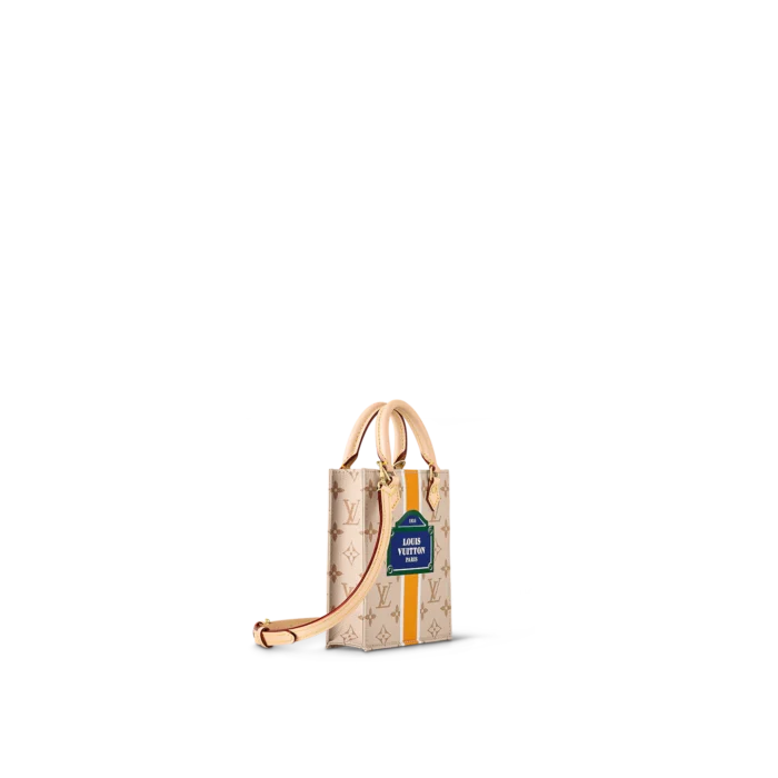Made from beige Monogram canvas with a textile-like printed effect, the Petit Sac Plat is decorated with a vertical white-and-ocher stripe. In the center of the bag is what looks like a typical Parisian street-sign, featuring the words “Louis Vuitton Paris.” In addition to the two rolled-leather top handles, there’s a removable and adjustable strap.