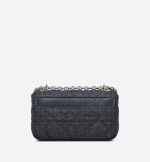 The Dior Caro bag combines modernity with timeless elegance. Crafted in navy blue felt with the Macrocannage motif. the bag features a flap adorned with a ruthenium-finish metal ‘CD’ twist clasp. inspired by the seal of a Christian Dior perfume bottle. The detachable chain shoulder strap with ‘CD’ signature links allows the medium bag to be carried by hand. worn over the shoulder or crossbody. It may also be replaced by one of the House’s wide embroidered straps for day or evening attire.