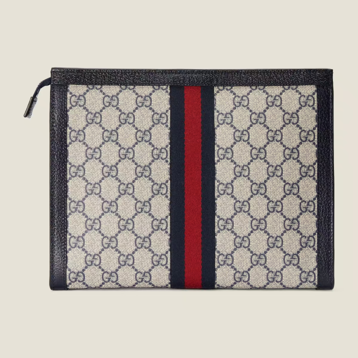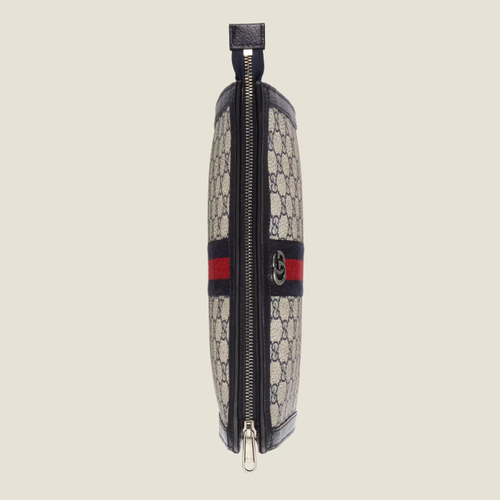Mirroring the material’s historic origins. GG Supreme is introduced in a timeless mix of blue and beige for Gucci Love Parade. The canvas has come to the front of each collection decade after decade to become a hallmark of the House. Here. the classic palette defines this slim Ophidia pouch.